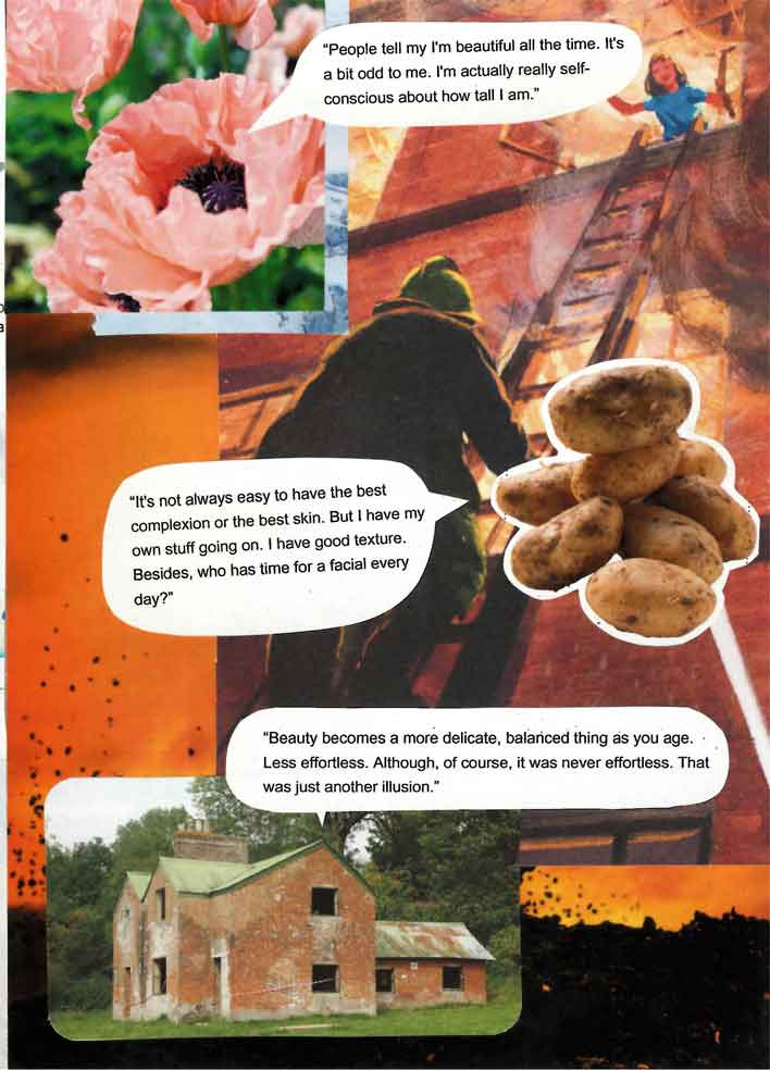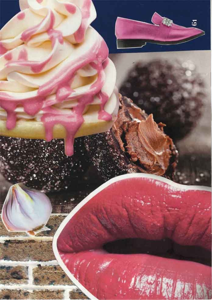 This page features a collage in brown and pinks, featuring ice cream, giant lipsticked lips and a pink shoe.