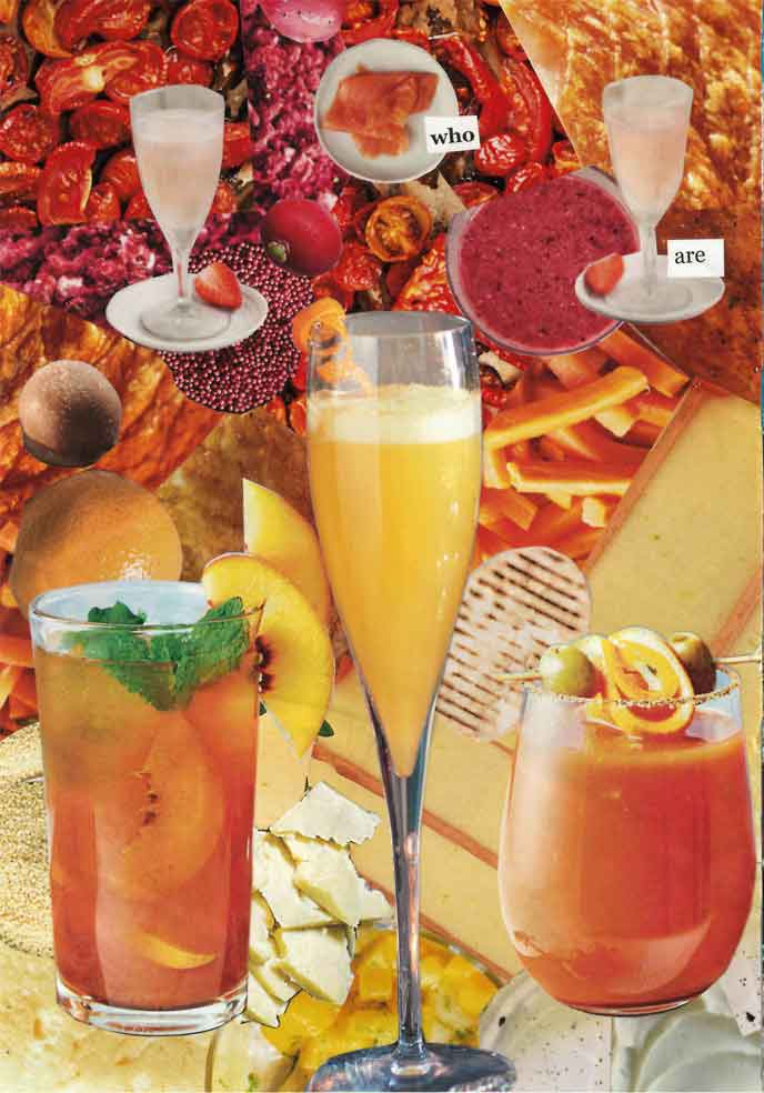 This page and the next feature a collage rainbow of food with fancy cocktails in the foreground.