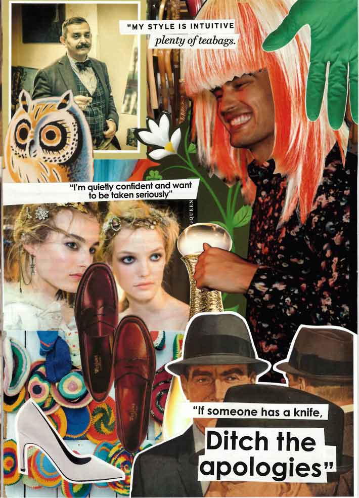 Collage with an owl, a chap in a three-piece, a grinning man in a huge wig, shoes, a perfume bottle, men wearing hats.