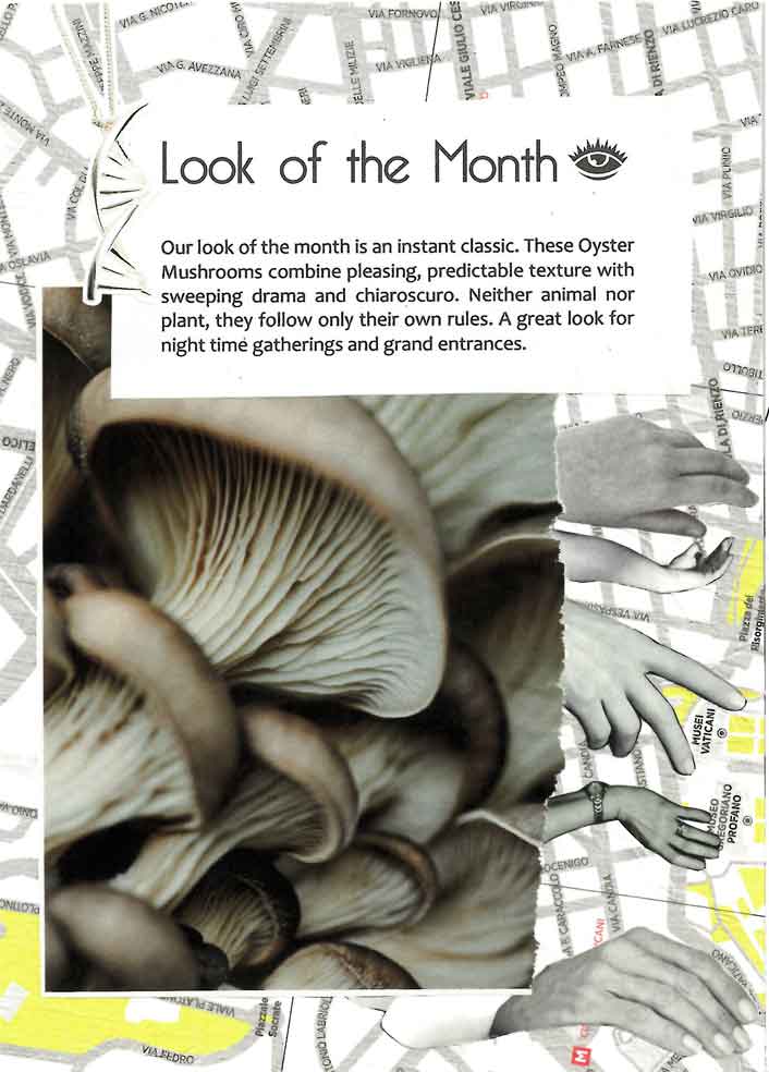 Our look of the month is an instant classic. These Oyster Mushrooms combine pleasing, predictable texture with sweeping drama and chiaroscuro. Neither animal nor plant, they follow their own rules. A great look for night time gatherings and grand entrances.
