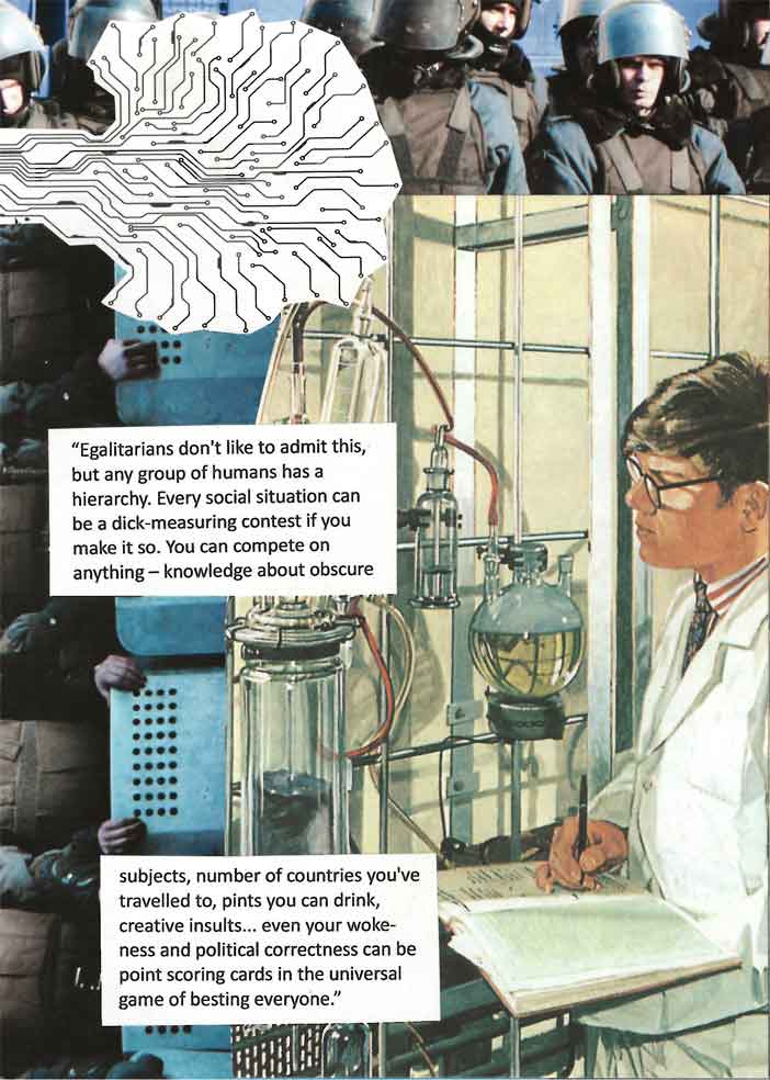 "Egalitarians don't like to admit this, but any group of humans has a hierarchy. Every social situation can be a dick-measuring contest if you make it so. You can compete on anything — knowledge about obscure subjects, number of countries you've travelled to, pints you can drink, creative insults... even your woke-ness and political correctness can be point scoring cards in the universal game of besting everyone."