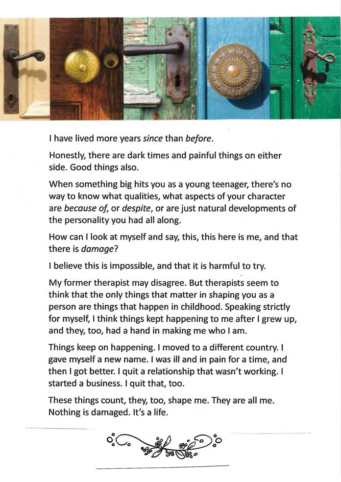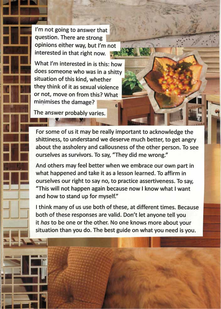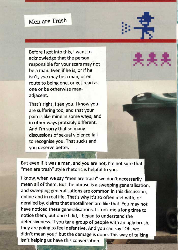 This is a zine about surviving sexual violence. We often talk a lot about the immediate trauma and not so much about how, with the years, it can be something that stays with you without defining you. It’s part of our histories for so many of us, and it remains difficult to talk about. So although I wrote this in 2018 and I don’t fully agree with everything I said in it, I humbly offer it, unedited, in its entirety in the hopes it is of use.